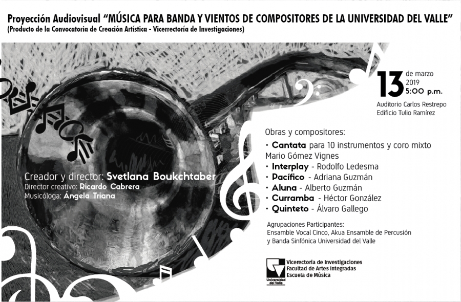 La Escuela de Música de la Facultad de Artes Integradas invita a la proyección audiovisual “Música para banda y vientos de Compositores de la Universidad del Valle” que se realizará el próximo miércoles 13 de marzo en el auditorio Carlos Restrepo- Edificio E15, a las 5:00 p.m.