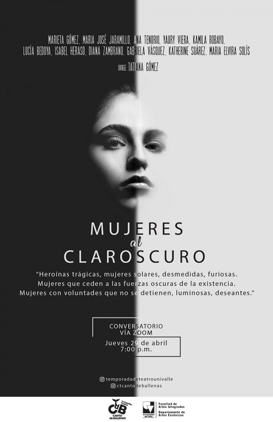 La temporada de teatro Univalle presenta Mujeres al Claroscuro, dirigida por Tatiana Gómez, de la Compañía Teatral Canto de Ballenas. Este proyecto audiovisual fue ganador de la beca de creación Colombia en Escena, Ministerio de Cultura 2020, donde se lleva a la pantalla a once heroínas oscuras del teatro. Canto de Ballenas es una compañía artística contemporánea, orientada a la creación e investigación escénica femenina. Está integrada por 11 mujeres creadoras, actrices, directoras y productoras de diferentes ciudades de Colombia y con diversos orígenes culturales y étnicos.