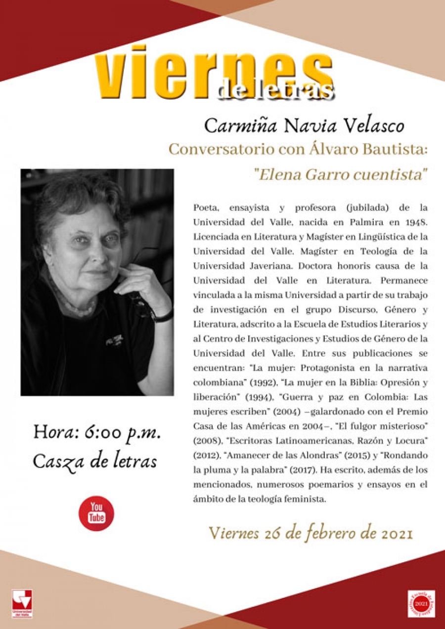 En esta oportunidad, la profesora Carmiña Navia Velasco, Doctora Honoris Causa de esta Universidad, estará en conversatorio con Álvaro Bautista Cabrera en torno a la cuentística de Elena Garro.
