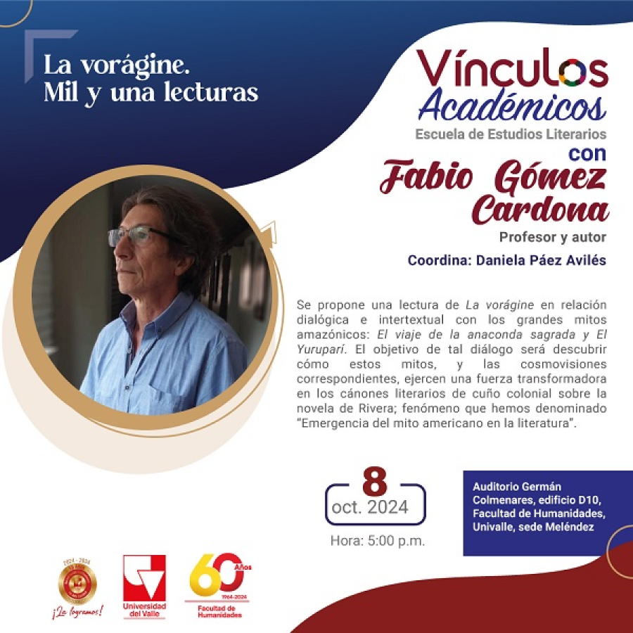 La Escuela de Estudios Literarios invita a la conferencia La vorágine: Mil y una lecturas del profesor Fabio Gómez, que se realizará este martes 8 de octubre, a las 5:00 pm, en el Auditorio Germán Colmenares.