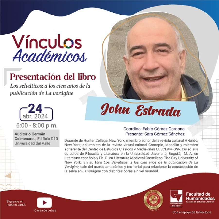 La Escuela de Estudios Literarios de la Universidad del Valle invita a la presentación del libro “Los selváticos: a los cien años de la publicación de La vorágine” del autor John Estrada. Est actividad se llevará a cabo este miércoles 24 de abril, a las 6:00 pm, en el Auditorio Germán Colmenares.