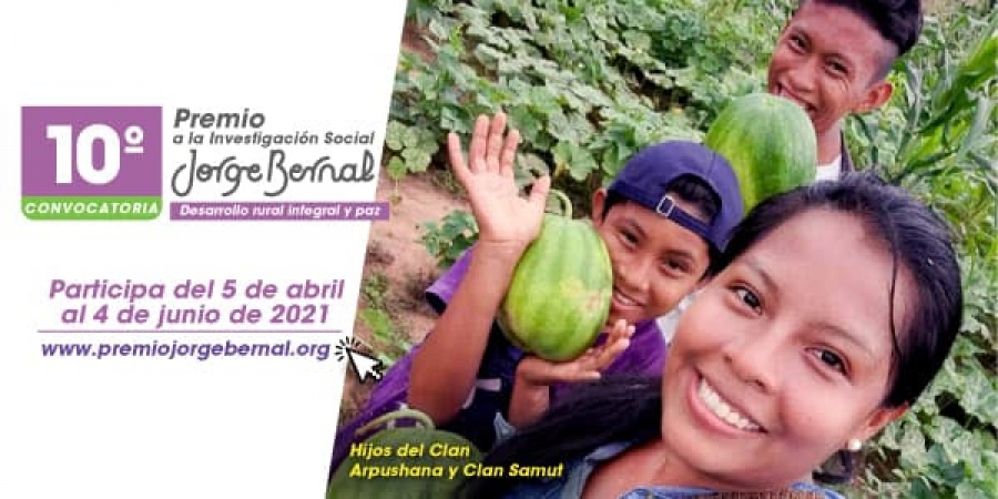 Le invitamos a conocer y participar de la convocatoria a la 10° versión del Premio Jorge Bernal a la investigación social, que estará abierta del 5 de abril hasta el 4 de junio, con la temática Desarrollo rural integral y paz, en la que podrán participar estudiantes de posgrado (maestría y doctorado), docentes de universidades públicas y privadas, investigadoras e investigadores adscritos a las diferentes organizaciones sociales de Colombia; en un rango de edad de 18 a 40 años cumplidos.