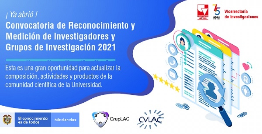 La última convocatoria nacional con este propósito se realizó en el 2018, en la que 5.772 registros de GrupLAC fueron reconocidos como Grupo de Investigación, Desarrollo Tecnológico o de Innovación. Por parte de Univalle, 181 grupos fueron medidos y clasificados en la anterior Convocatoria, de los cuales 29 son categoría A1, 49 A, 31 B, 70 C y 2 reconocidos.