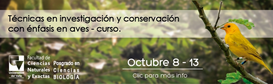 Entre el 8 y el 13 de octubre se realizará el Curso de Técnicas en investigación y conservación con énfasis en aves, que ofrece el Posgrado en Ciencias – Biología de la Universidad del Valle a estudiantes de pre y posgrado de Biología o ciencias afines, docentes, investigadores y particulares con interés en conocer los métodos de campo empleados en investigación de fauna en vida silvestre.