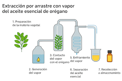 Este es un método tradicional y ampliamente utilizado para la producción de aceites esenciales. Consiste en hacer pasar una corriente de vapor de agua a través de la biomasa de orégano (hojas y tallos) para arrastrar sus compuestos volátiles (sustancias que fácilmente se evaporan). Luego, los vapores se enfrían y se condensan, formando una mezcla líquida de la que, mediante decantación, puede obtenerse con facilidad el aceite esencial.
