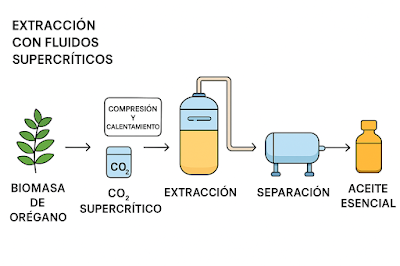 Se trata de una técnica moderna en la que se utiliza CO₂ en estado supercrítico; un estado que combina características de sus estados líquido (alta densidad) y gaseoso (baja viscosidad y alta difusividad); junto con un cosolvente, en este caso etanol, para disolver la biomasa de orégano. En esta condición, el dióxido de carbono penetra con mayor facilidad la matriz vegetal y captura una amplia variedad de compuestos, los cuales son liberados en forma líquida o sólida cuando el CO₂ retorna a su estado gaseoso.