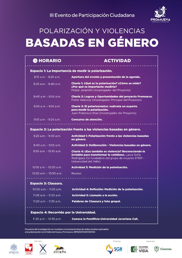 Este 27 de agosto, equipos de investigación de diferentes universidades compartirán los resultados de la medición sobre la polarización social con enfoque de género. Además, debatirán con las y los asistentes estrategias para construir diálogos más respetuosos y responsables. El evento se llevará a cabo en la Pontificia Universidad Javeriana de Cali, desde las 8:00 a.m.