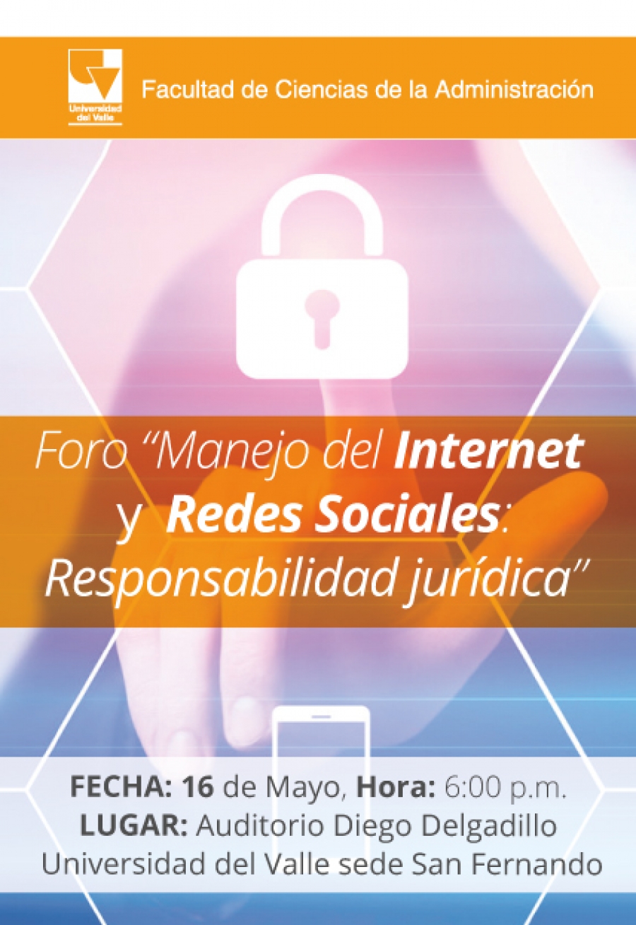 El Grupo de investigación “Derecho, Sociedad y Estado” de la Facultad de Ciencias de la Administración de la Universidad del Valle, con el apoyo de Futuro Colombia y la Fiscalía General de la Nación llevará a cabo el Foro “Manejo del Internet y redes sociales: responsabilidad jurídica”, el 16 de mayo, a partir de las 6:00 p.m. en el Auditorio Diego Delgadillo del Campus San Fernando.