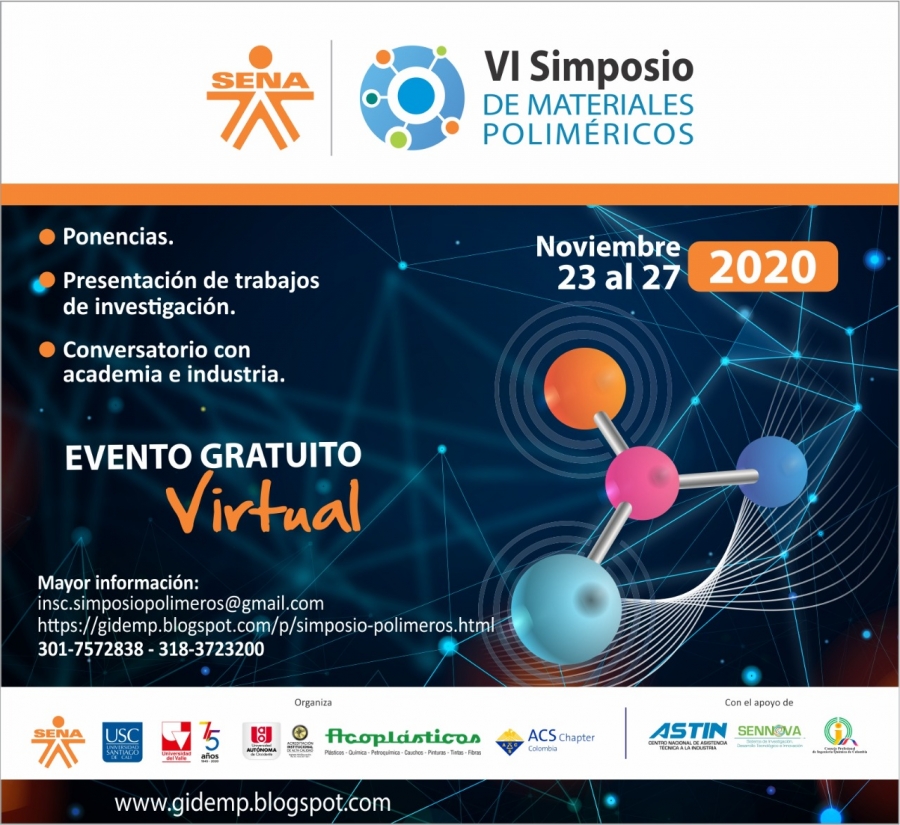 La Universidad del Valle, el Centro Nacional De Asistencia Técnica a la Industria ASTIN - SENA Regional Valle, la Universidad Santiago de Cali, la Universidad Autónoma de Occidente y Acoplásticos, invitan a las personas interesadas a participar del VI Simposio de Materiales Poliméricos, que se llevará a cabo del 23 al 27 de noviembre de 2020. Este año debido a la emergencia sanitaria por el COVID-19. El evento se realizará de manera virtual y gratuita.
