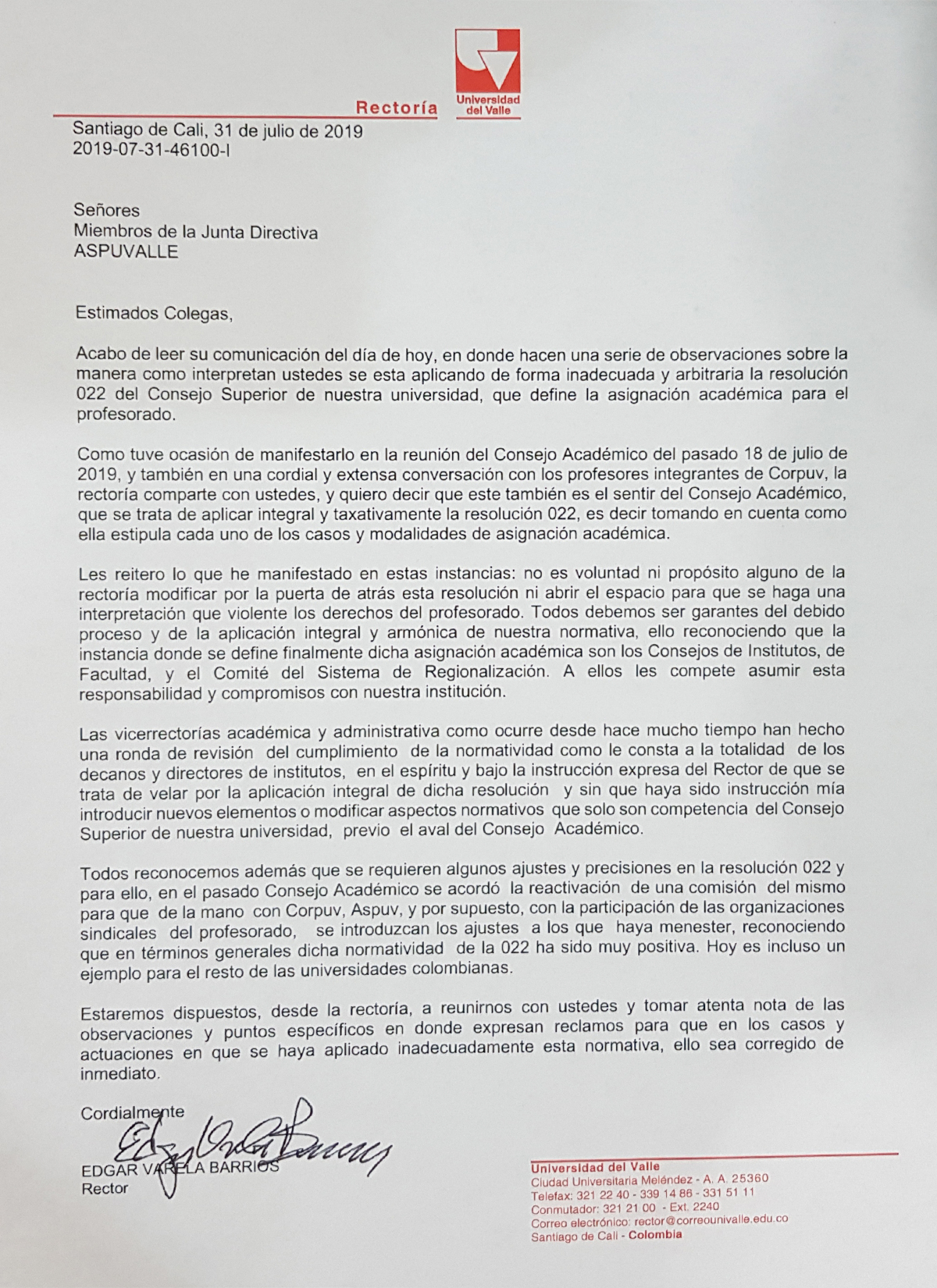 Carta del Rector a ASPUVALLE sobre resolución 022 del Consejo Superior