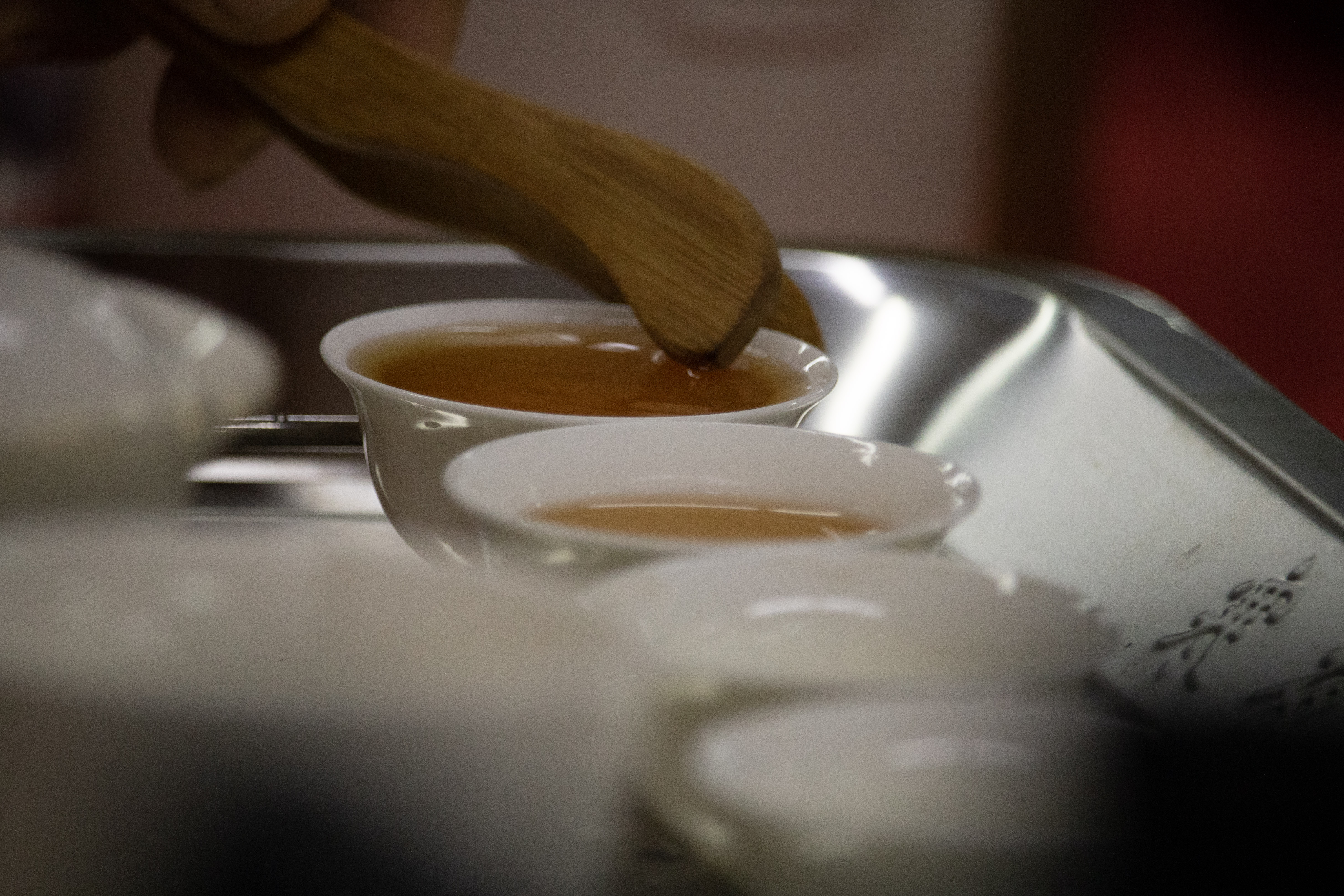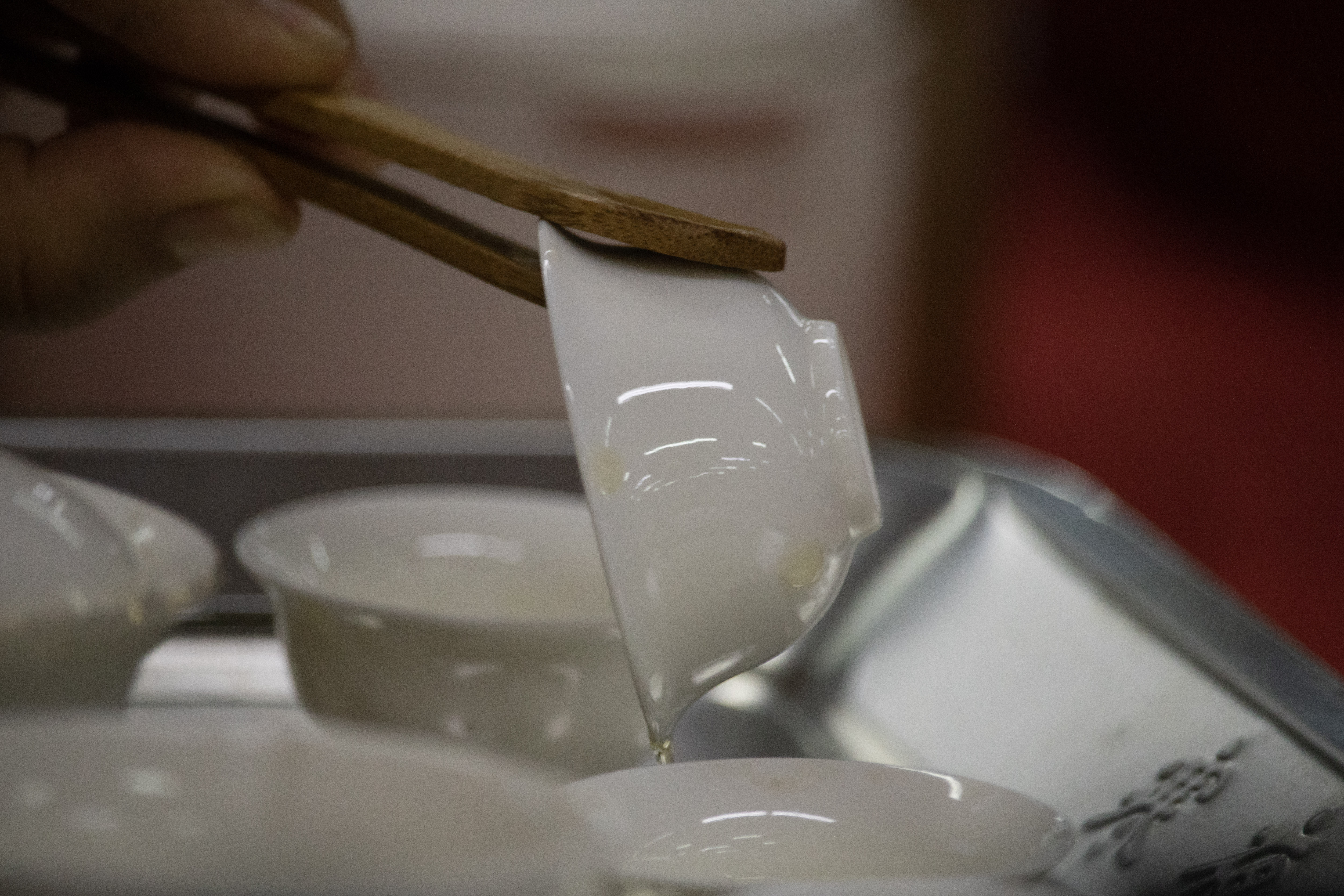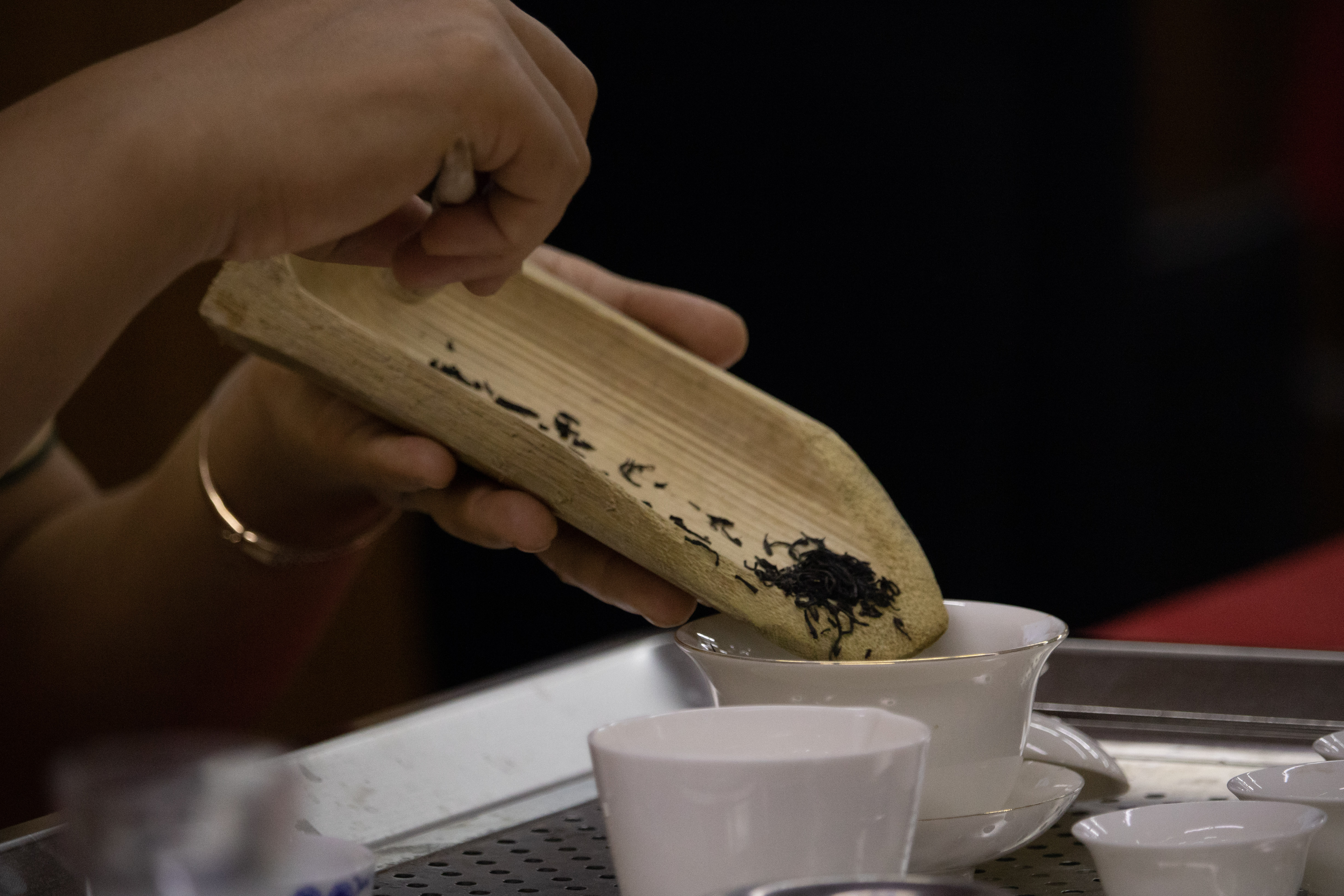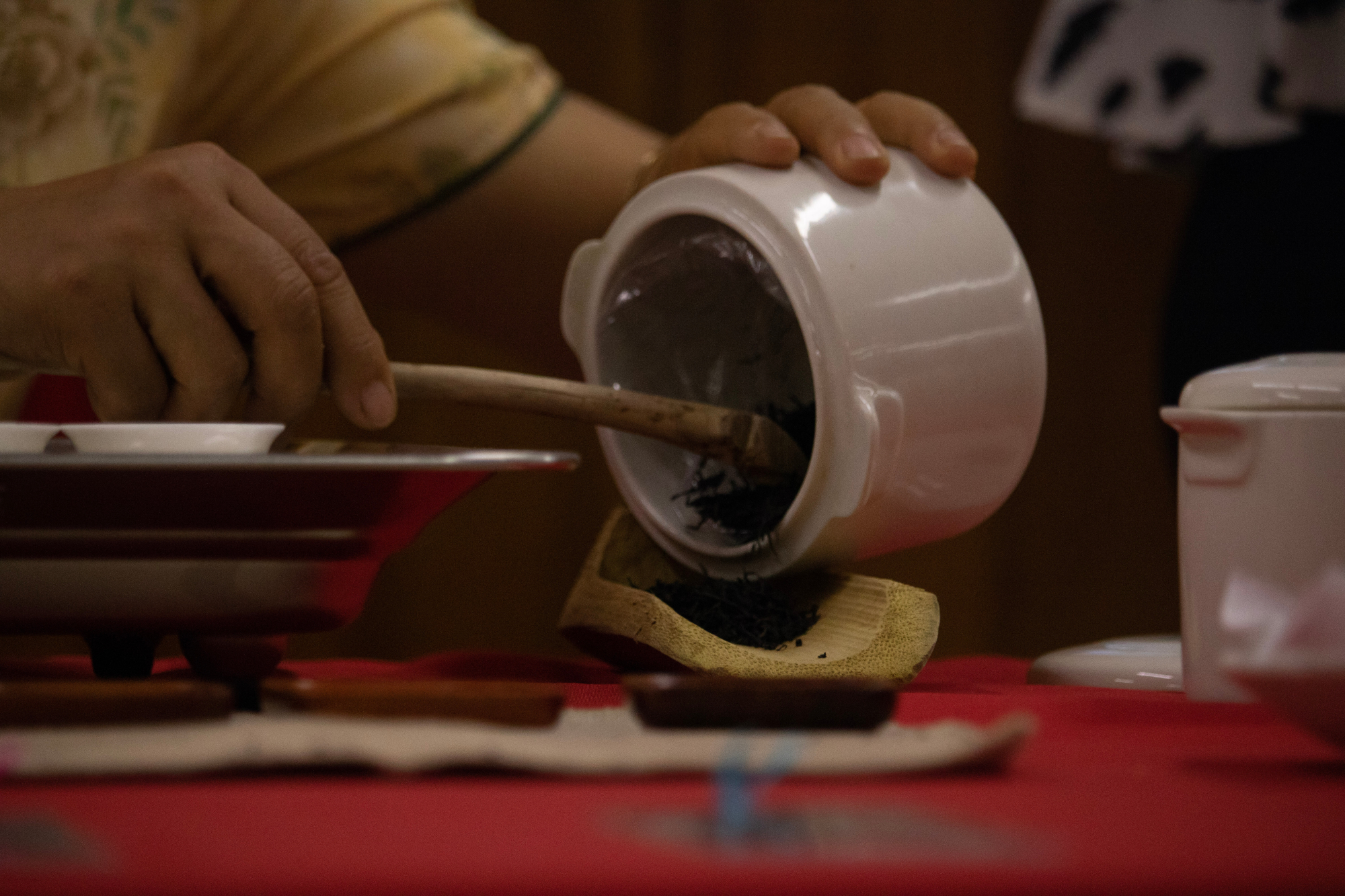 El protocolo se llama Gongfu Cha, que significa ‘tomar el tiempo para el té’. Así pues, Candy comienza por presentar el frasco a los espectadores como un sommelier que indica la botella de vino en la mesa. Posteriormente, toma con una cuchara de bambú las hojitas secas de té rojo y las ubica sobre un plato a la vista de todos.