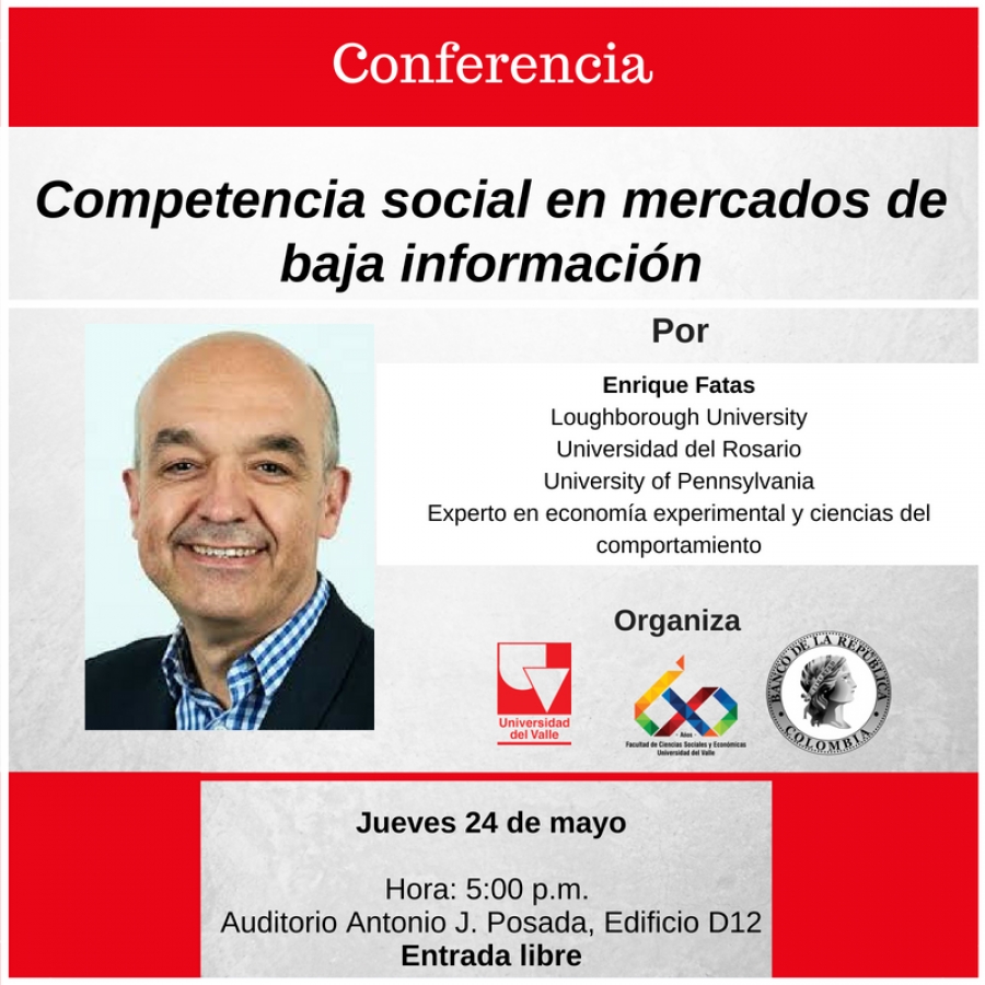 La charla ‘Competencia social en mercados de baja información’ se realizará el jueves 24 de mayo en el Auditorio Antonio J. Posada a las 5:00 p.m.