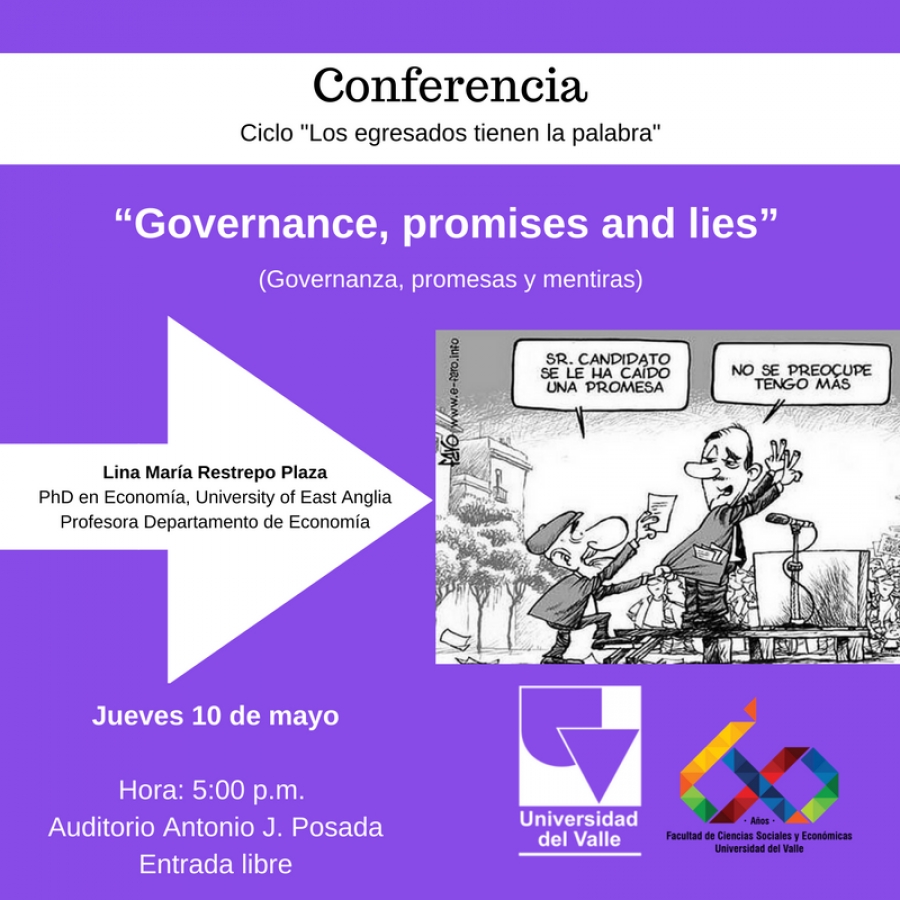La charla 'Governance, promises and lies' (Governanza, promesas y mentiras) será el próximo jueves 10 de mayo, como parte del ciclo 'Los egresados tienen la palabra', que organiza la Facultad de Ciencias Sociales y Económicas de la Universidad del Valle.
