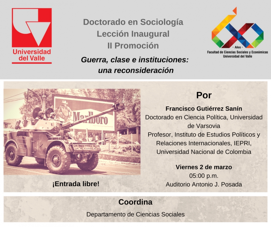 La charla ‘Guerra, clase e instituciones: una reconsideración’ será el viernes 2 de marzo a las 5:00 p.m. en el Auditorio Antonio J. Posada de la Universidad del Valle, Campus de Meléndez.