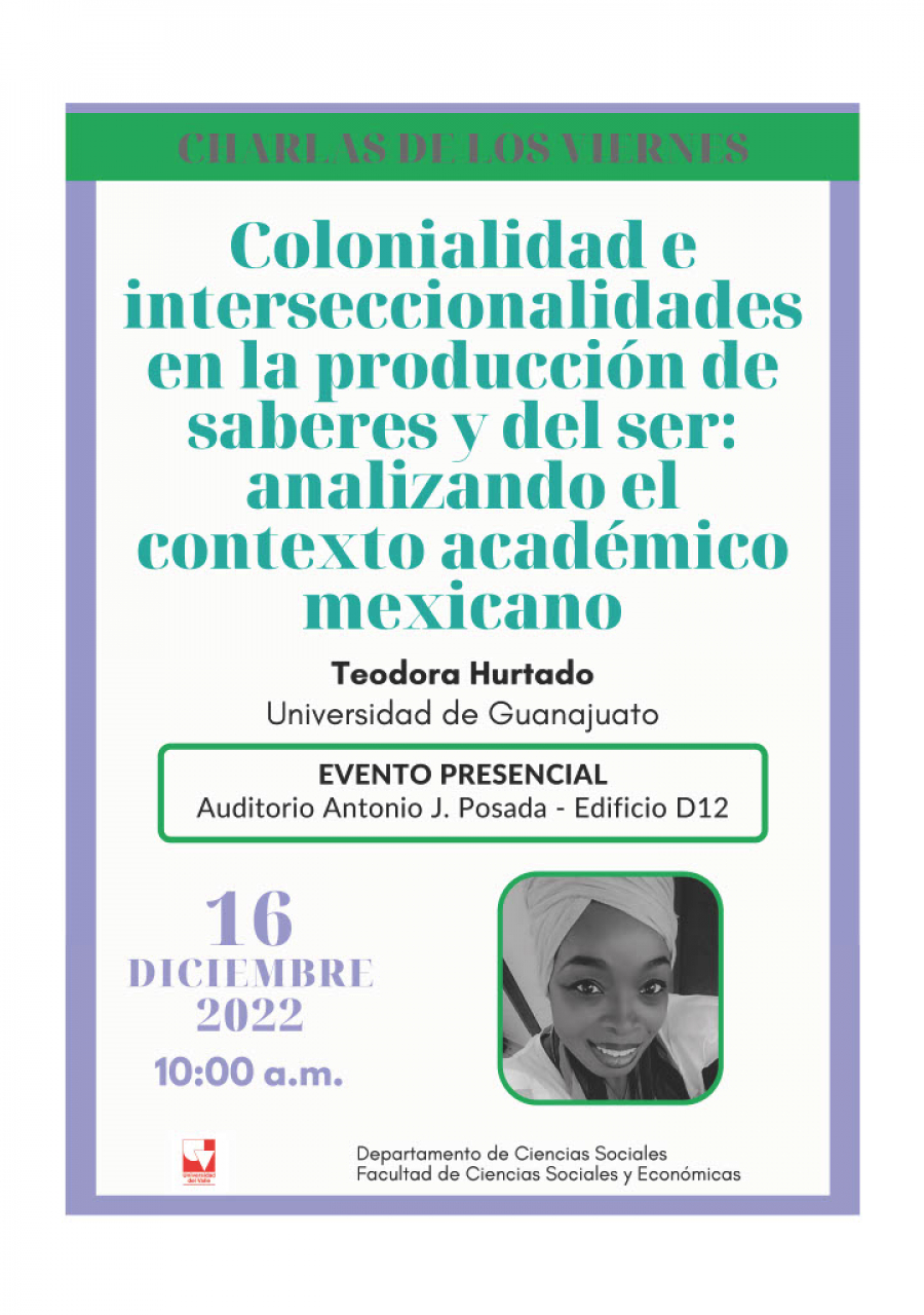 Como parte de las “Charlas de los Viernes” se presentará la conferencia "Colonialidad e interseccionalidades en la producción de saberes y del ser: analizando el contexto académico mexicano", en la cual se discutirá acerca de la dimensión de la colonialidad e interseccionalidad en la producción intelectual mexicana.