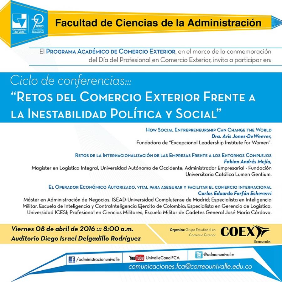 El programa Académico de Comercio Exterior y el grupo estudiantil COEX, como parte de la Conmemoración del Día del Profesional en comercio Exterior, invita a la comunidad académica y público en general a participar del Ciclo de Conferencias “Retos del Comercio Exterior frente a la inestabilidad política y social”, el viernes 08 de abril en el Auditorio Diego Israel Delgadillo de la Facultad de Ciencias de la Administración de la Universidad del Valle, a partir de las 8:00 a.m.