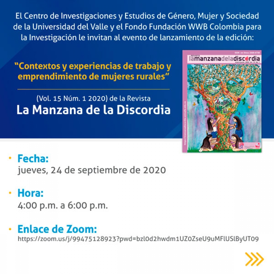 El Centro de Investigaciones y Estudios de Género, Mujer y Sociedad - CIEGMS de la Universidad del Valle invita al conversatorio: "Contextos y experiencias de trabajo y emprendimiento de mujeres rurales" que se realizará este jueves 24 de septiembre, a las 4:00 p.m., con la participación de las autoras de los artículos del vol. 15, núm. 1 de la Revista La Manzana de la Discordia, dedicado a esta temática.