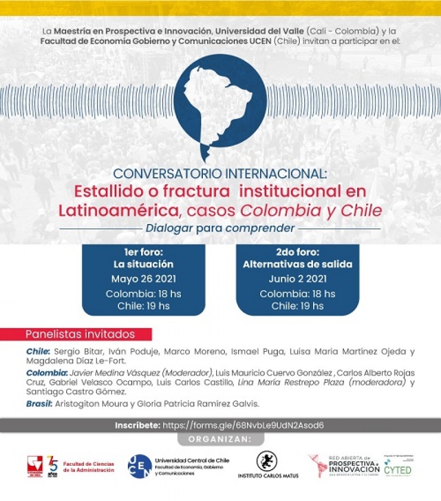 El próximo miércoles 26 de mayo y miércoles 02 de junio a las 6:00 p.m. (hora Colombia) y 7:00 p.m. (hora Chile), se llevará a cabo de manera virtual, el Conversatorio Internacional Estallido o fractura institucional en Latinoamérica, casos Colombia y Chile, el cual tiene como propósito analizar las crisis político-institucionales recientes en América Latina, específicamente las ocurridas en Colombia y en el país austral.