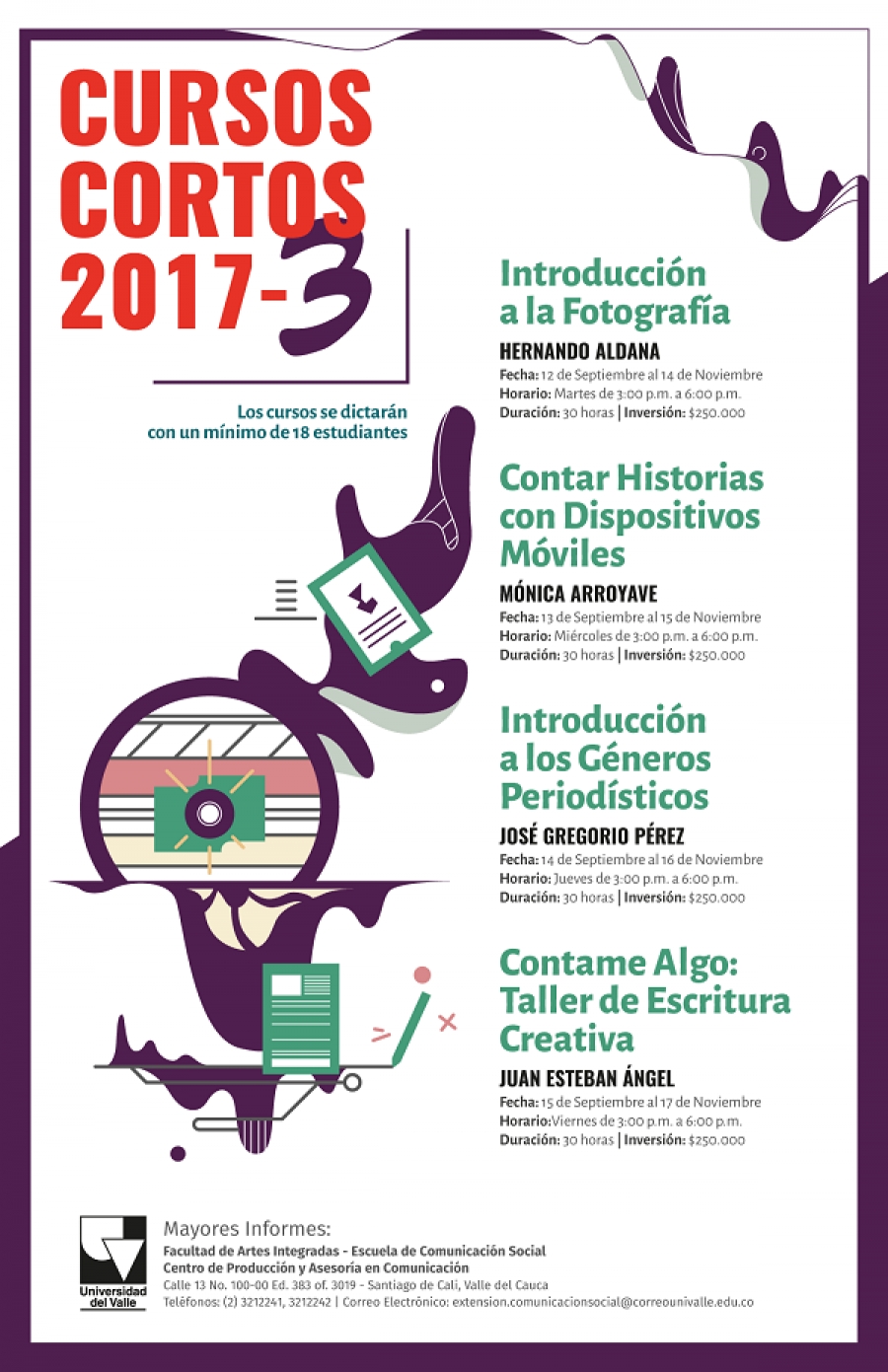 La Escuela de Comunicación Social de la Universidad del Valle presenta su oferta de cursos de extensión para el segundo semestre de 2017. Talleres de fotografía, escritura y periodismo al alcance de todos.