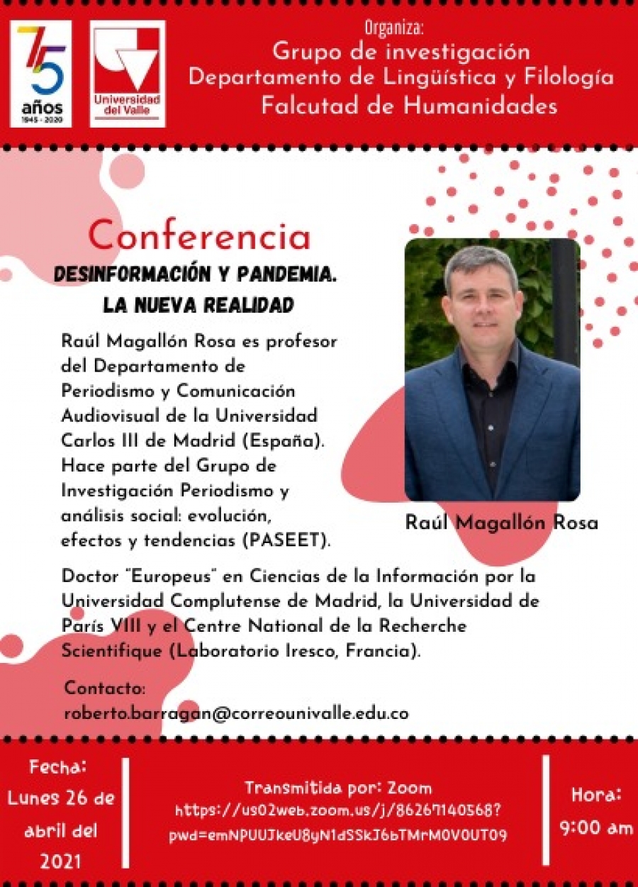 El grupo de investigación Literacidad y Educación del Departamento de Lingüística y Filología se complace en invitar a la conferencia Desinformación y pandemia. La nueva realidad, a cargo del profesor Raúl Magallón Rosa, profesor del Departamento de Periodismo y Comunicación Audiovisual de la Universidad Carlos III de Madrid.