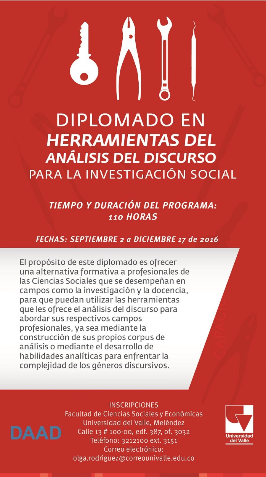 La Facultad de Ciencias Sociales y Económicas de la Universidad del Valle abre inscripciones para el “Diplomado en Herramientas del análisis del discurso para la investigación social”, que se desarrollará del 2 de septiembre al 17 de diciembre de 2016. Las inscripciones estarán abiertas hasta el 5 de agosto, pero de inscribirse antes del 30 de junio se realizará un descuento.