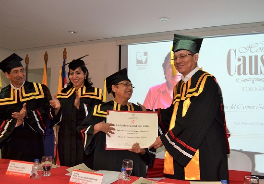 El diploma que acredita a la profesora María del Carmen Zúñiga como Doctora Honoris Causa en Biología lo entregó el rector Edgar Varela Barrios quien sostuvo que el trabajo de la docente no solo ha hecho contribuciones a la biología sino también en salud e ingeniería, áreas en los que hay alumnos suyos que ahora son profesores muy reconocidos.