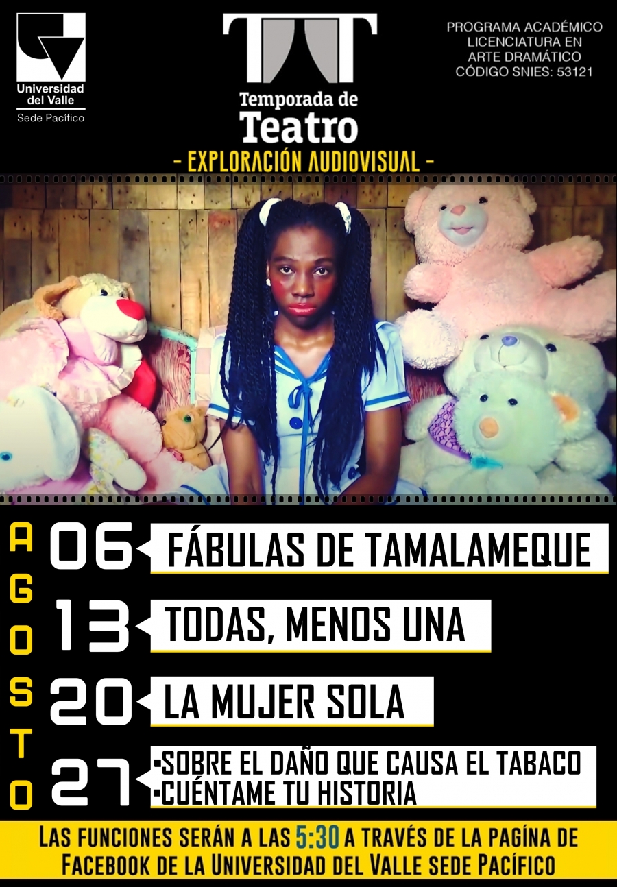 Los estudiantes programa académico de Licenciatura en Arte Dramático de la Universidad del Valle sede Pacífico demostrarán todo su talento durante la temporada de teatro Exploración Audiovisual, que llevará grandes obras del teatro mundial y adaptaciones libres pensadas en el pacífico colombiano a las pantallas de todos los espectadores y amantes de la dramaturgia.