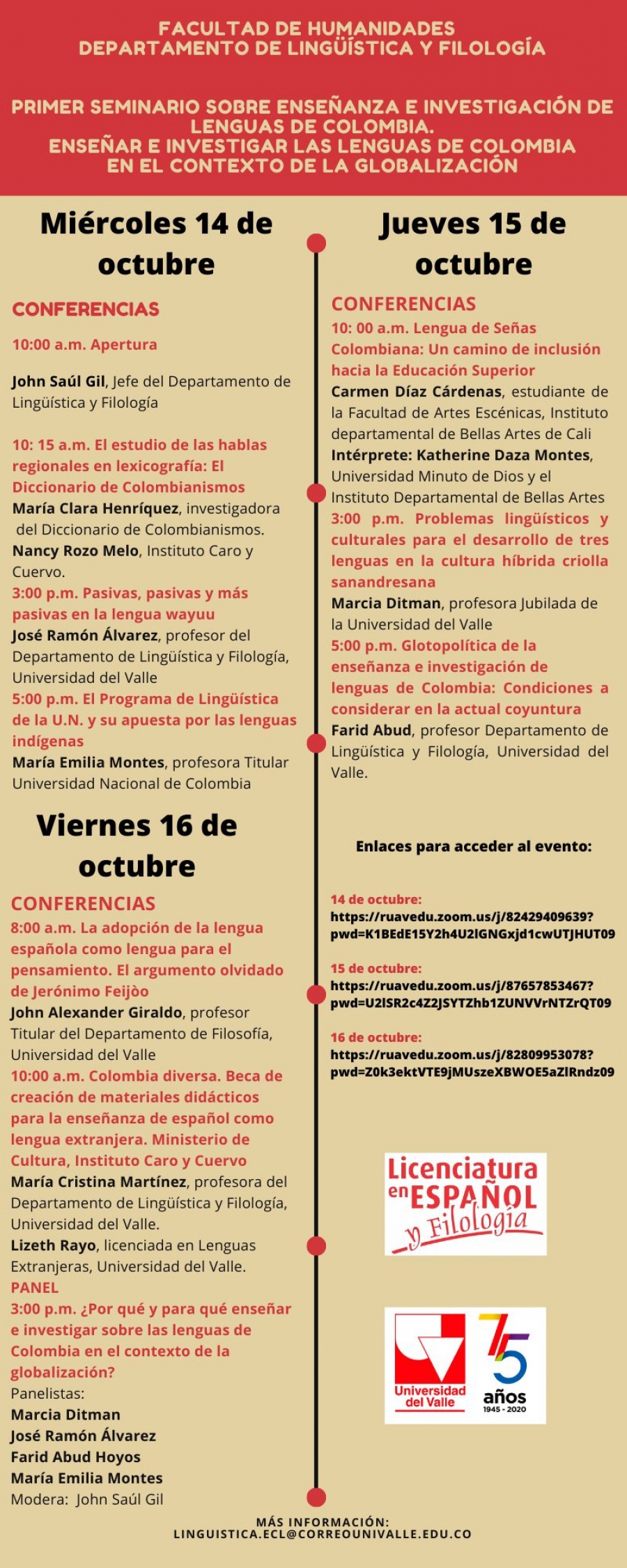 El Departamento de Lingüística y Filología de la Facultad de Humanidades de la Universidad del Valle organiza el Primer Seminario sobre enseñanza e investigación de lenguas de Colombia, el cual tendrá lugar entre el 14 y el 16 de octubre próximo.