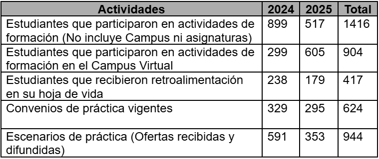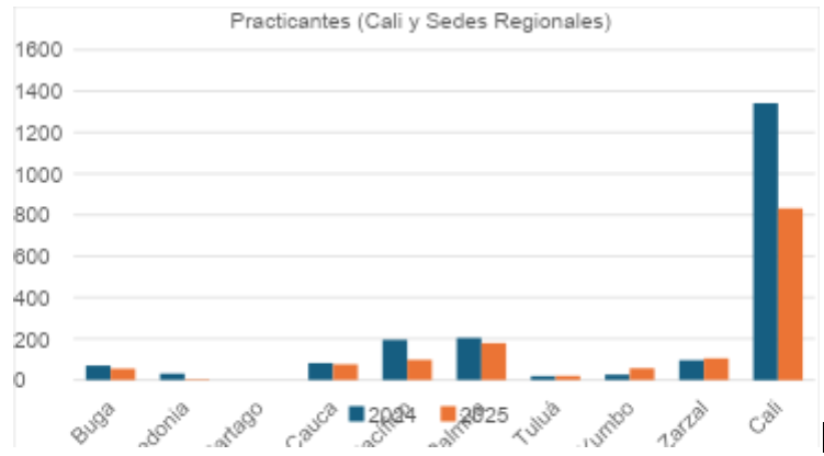 En el periodo 2024–2025 se consolidaron acciones orientadas a fortalecer la formación integral de los estudiantes y su tránsito al mundo del trabajo. A través del Programa de Prácticas, se registraron 3.478 estudiantes matriculados en prácticas, de los cuales 2.173 corresponden a Cali y 1.305 a sedes regionales y seccionales, lo cual evidencia el impacto territorial de esta estrategia.