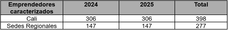Durante 2024 y 2025 se registraron 1.464 estudiantes matriculados en asignaturas de emprendimiento. En el mismo periodo, se caracterizaron 675 emprendedores, de los cuales 277 corresponden a sedes regionales y seccionales, como se puede observar en la siguiente tabla