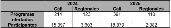 Vanguardia Pedagógica: En 2024–2025 se ofertaron 605 programas, con más de 39.000 participantes, distribuidos entre Cali y sedes regionales. Los cuales se pueden ver disgregados en la siguiente tabla:
