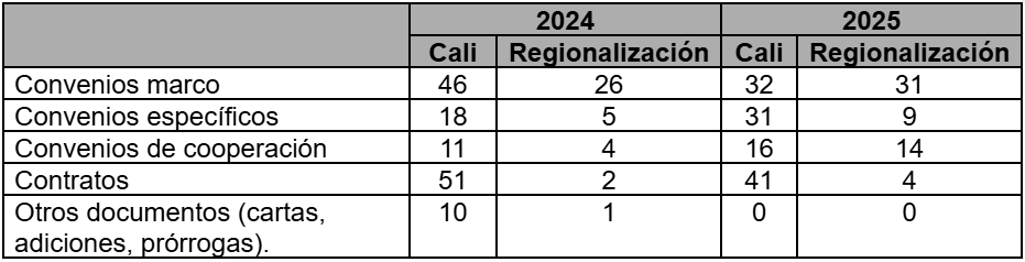 Gestión y formalización de proyectos y/o servicios: En la vigencia se trabajó en la consolidación de la Ruta para la Gestión Integral de Proyectos y Servicios de Extensión y Proyección Social, mediante la cual se formalizaron un total de 352 convenios/contratos con participación tanto de Cali como de las sedes regionales como se puede observar en la siguiente tabla: