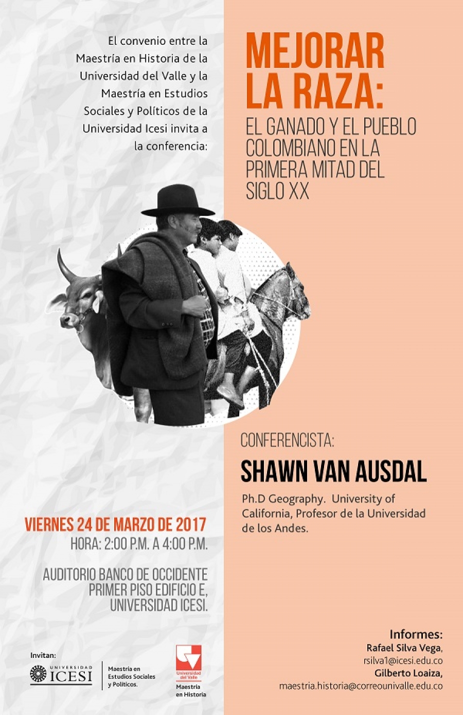 Durante el evento se llevará a cabo la conferencia central: Mejorar la raza: el ganado y el pueblo colombiano en la primera mitad del siglo XX, a cargo del profesor Shawn Van Ausdal, doctor en filosofía y geografía de la Universidad de California, Estados Unidos, y profesor de la Universidad de Los Andes, Colombia.