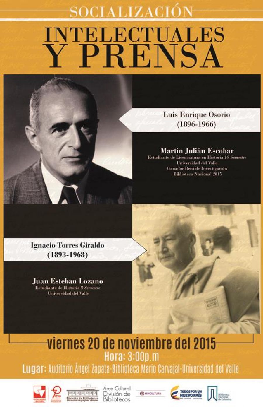 Con el propósito de compartir el proceso de digitalización del archivo personal de Ignacio Torres Giraldo (1893-1968) y el resultado investigativo en torno a la vida y obra de Luis Enrique Osorio Morales (1896-1966), la División de Bibliotecas de la Universidad del Valle organiza la Socialización: intelectuales y prensa, mañana viernes 20 de noviembre de 2015, a las 3:00 p.m., en el Auditorio Ángel Zapata, Campus Meléndez.