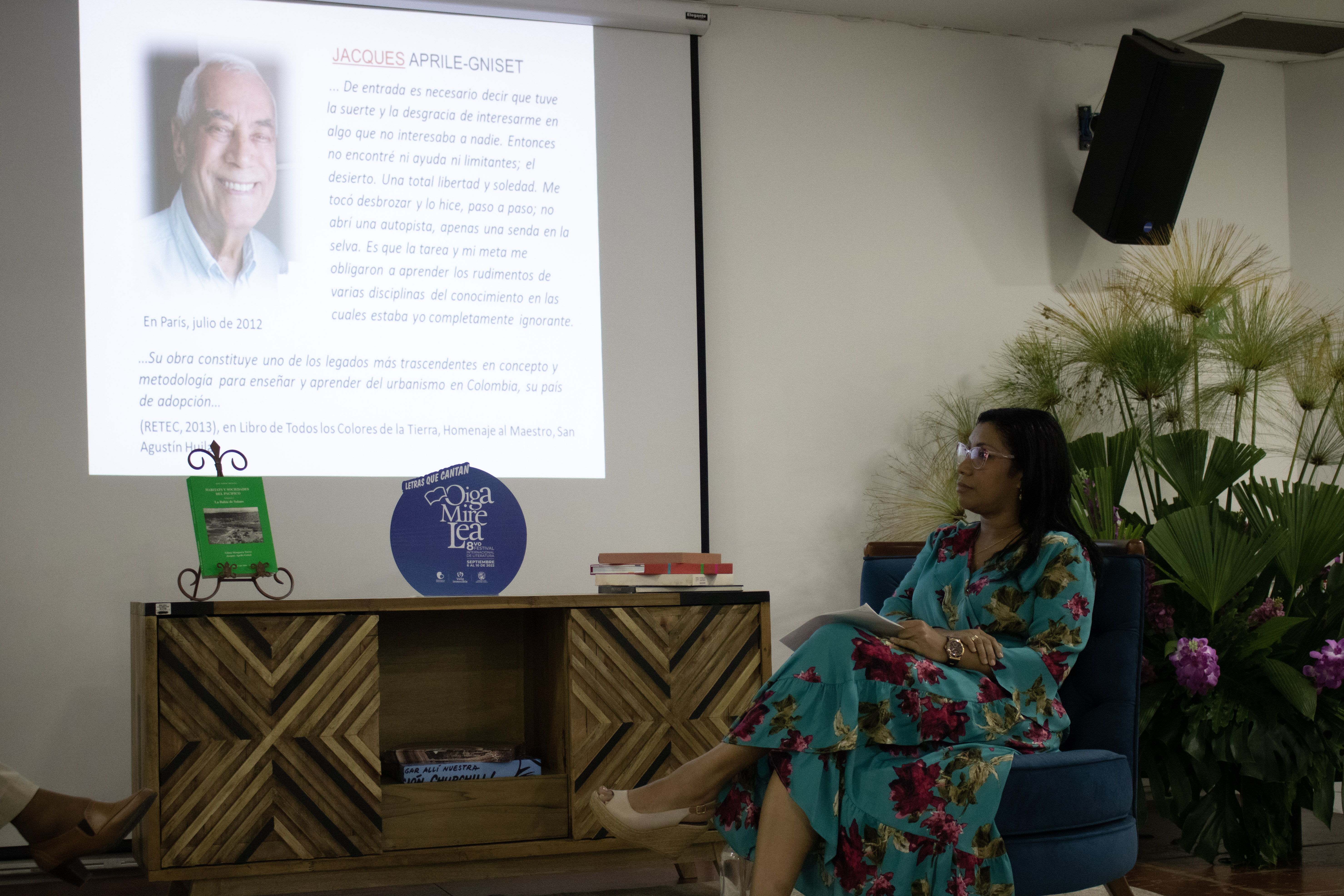 Las dos invitadas volvieron a esos tiempos cuando la entonces alumna Luz Estella Díaz formulaba preguntas en clase, pero, esta vez, frente al auditorio del Festival y con el tema central de la obra de la maestra Gilma titulada “Hábitats y Sociedades del Pacífico, Volumen I”, coescrito con su esposo, el urbanista Jacques Aprile Gniset, quien fuera también director de la tesis de maestría de la entrevistadora Luz Estella Díaz. La sesión fue dedicada a su memoria.