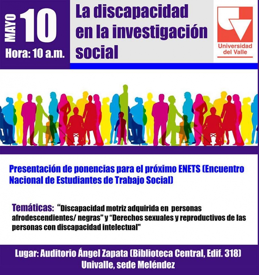 Estudiantes de Trabajo Social de la Universidad del Valle invitan al foro “La discapacidad en la investigación social”, que se realizará este miércoles 9 de mayo, a las 10:00 a.m., en el Auditorio Ángel Zapata, Biblioteca Mario Carvajal, Meléndez.