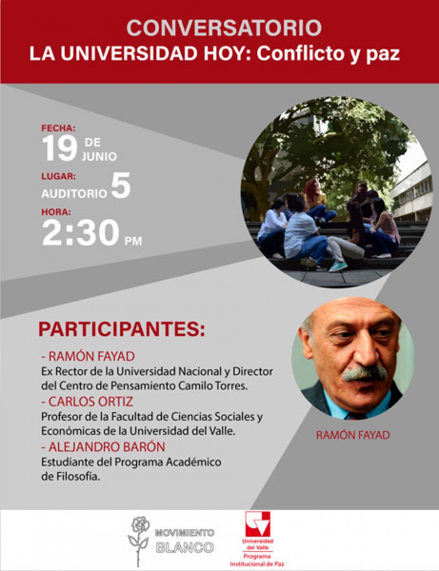 El Movimiento Blanco y el Programa Institucional de Paz de la Universidad del Valle invitan al conversatorio La Universidad Hoy: Conflicto y paz, que se realizará este miércoles 19 de junio, a las 2:30 p.m., en el auditorio 5, Campus de Meléndez.