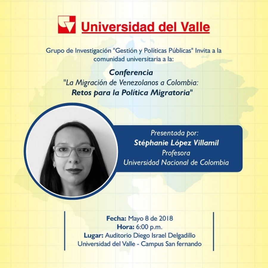 La Facultad de Ciencias de la Administración de la Universidad del Valle invita la conferencia “La Migración de Venezolanos a Colombia: Retos para la Política Migratoria”, que se realizará este martes 8 de mayo, a las 6:00 pm, en el Auditorio Diego Israel Delgadillo, Campus San Fernando. La entrada es libre.