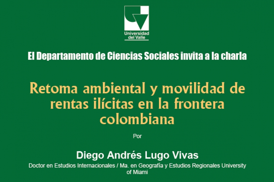 El Departamento de Ciencias Sociales de la Universidad del Valle invita el próximo viernes 15 de marzo a la charla 'Retoma ambiental y movilidad de rentas ilícitas en la frontera colombiana'. El evento se desarrolla en el marco de Charlas de los Viernes, un espacio de construcción académica donde se incentiva el pensamiento crítico mediante el debate con prestigiosos investigadores.