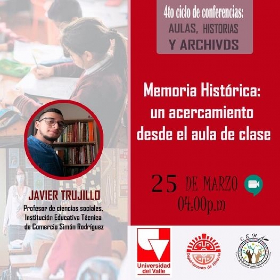 El grupo de investigación CEHA, Centro de Estudios Históricos y Ambientales, adscrito al Departamento de Historia de la Universidad del Valle, se complace en invitarles a la presentación "Memoria histórica: un acercamiento desde el aula de clase”, el cual hace parte de su cuarto Ciclo de Conferencias: aulas, historias y archivos.