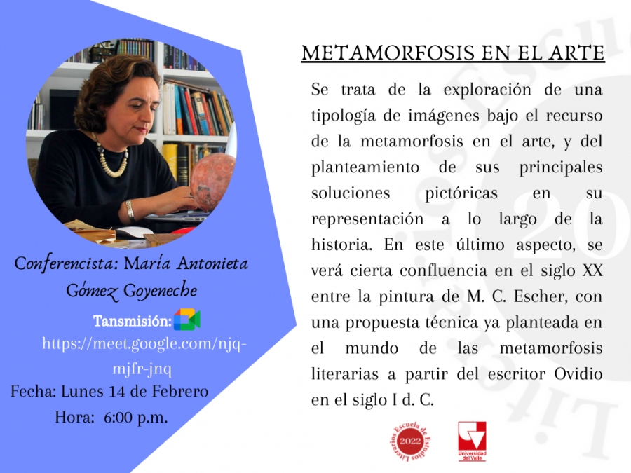 La Escuela de Estudios Literarios de la Universidad del Valle invita a la conferencia «Metamorfosis en el arte», a cargo de la profesora de esta Escuela María Eugenia Gómez Goyeneche.