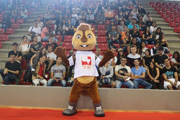 Durante la bienvenida, se presentó a la mascota de la Universidad del Valle: una ardilla que viste camiseta blanca, zapatos y maletín a la espalda.