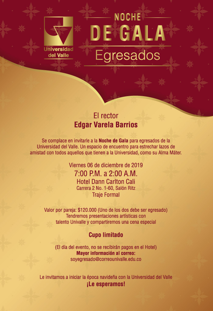 La Noche de Gala de egresados de la Universidad del Valle es un encuentro que busca afianzar los lazos de amistad y unión para aquellos que han tenido a la Universidad como su Alma Máter. Cada año, éste será un encuentro especial con toda la familia Univalluna. Una noche llena de alegría y color que incluirá una cena especial, la presentación de la Orquesta de Salsa de la Universidad así como muestras culturales y artísticas.