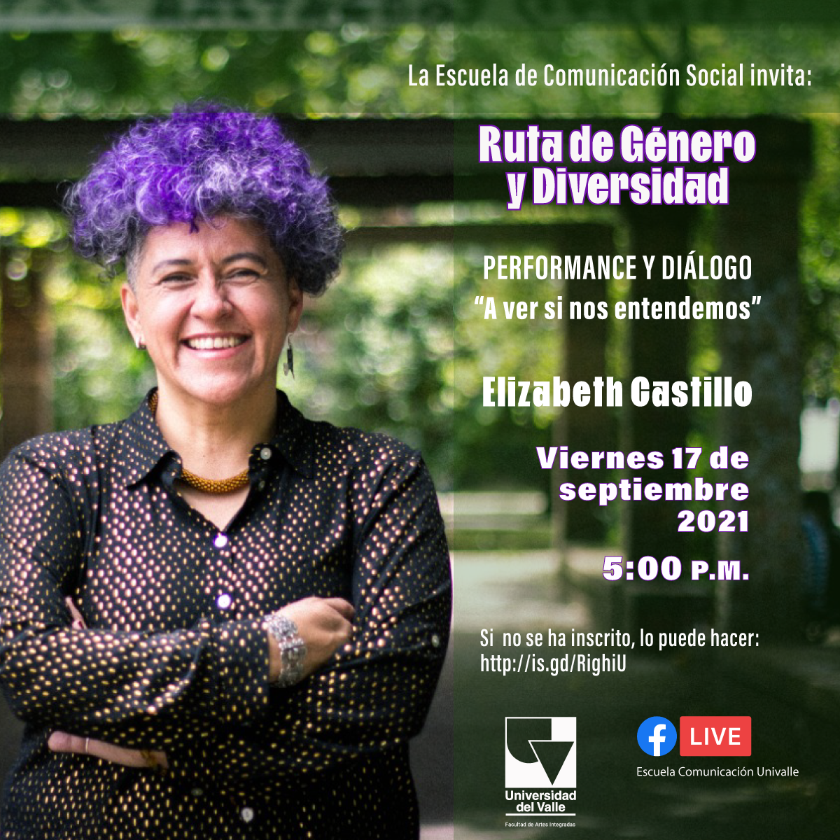 La Escuela de Comunicación Social invita a toda la comunidad universitaria al performance y diálogo “A ver si nos entendemos”, a cargo de Elizabeth Castillo Vargas. El evento, que hace parte de la Ruta de Género y Diversidad de la Escuela, se llevará a cabo este viernes 17 de septiembre a las 5:00 p.m.