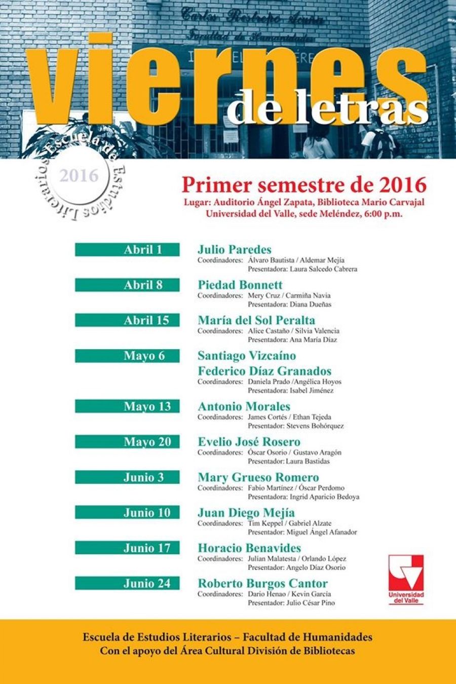 Piedad Bonnett es la invitada este ocho de abril a “Viernes de Letras”, ciclo de conferencias coordinado por la Escuela de Estudios Literarios, en el auditorio Ángel Zapata de la Biblioteca Mario Carvajal, Universidad del Valle, campus Meléndez, todos los viernes a las 6:00 p.m.