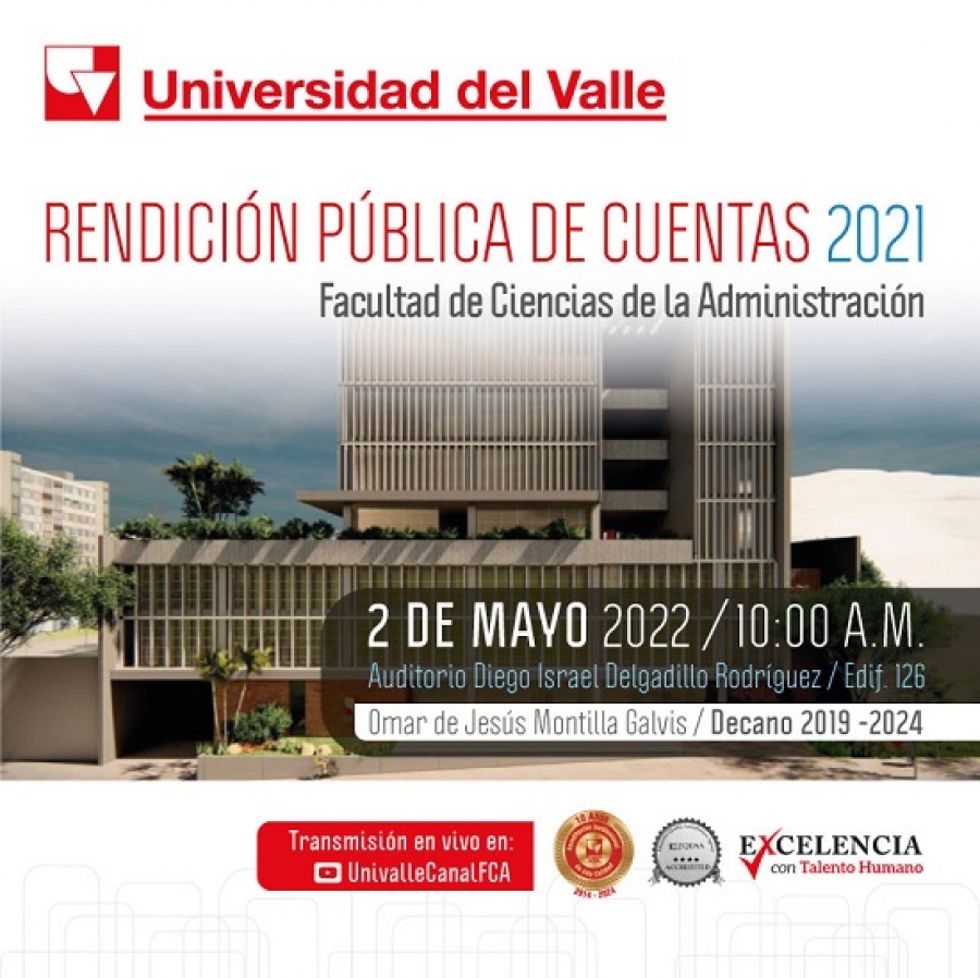 Como un mecanismo de transparencia y acceso a la información pública en concordancia con las Políticas de Buen Gobierno de la Universidad del Valle, la Facultad de Ciencias de la Administración invita a la comunidad universitaria y público en general al acto de Rendición Pública de Cuentas, vigencia 2021.