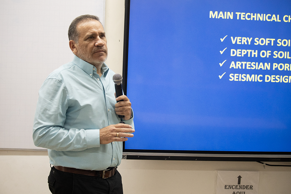 La conversación, donde participaron estudiantes de pregrado, maestría y doctorado, estuvo orientada alrededor de los principales retos de la ingeniería en la construcción de puertos en zonas con un espesor de lodo de 50 metros, así como el uso de tecnologías de punta y adaptación de los proyectos a los contextos específicos.