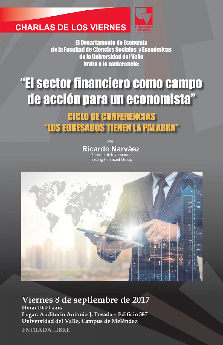 La charla 'El sector financiero como campo de acción para un economista', que organiza el Departamento de Economía de la Universidad del Valle, se realizará este viernes 8 de septiembre, a las 10:00 a.m, en el Auditorio Antonio J. Posada, edificio 387, del Campus Universitario de Meléndez.