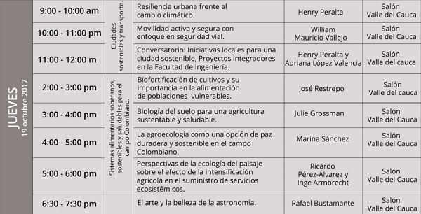 En el desarrollo de los temas participa Carlos Costa Posada, ex ministro de ambiente; Julie Grossman posdoctorada en Biología del Suelo de la Universidad de Minnesota; Juergen Louger vicepresidente de ingeniería y proyectos de Ecopetrol; Dana Rocío Ávila Lozano Doctora (Ph.D) en ingeniera agrónoma de la U.N; Marina Sánchez de Prager Doctora (Ph.D.) en ingeniera agrónoma de la Universidad Politécnica Madrid; Henry Peralta, especialista en reducción de riesgo y desarrollo local sostenible, OIT/ONU y Adriana Patricia López Valencia Doctora Ciencias Ambientales.