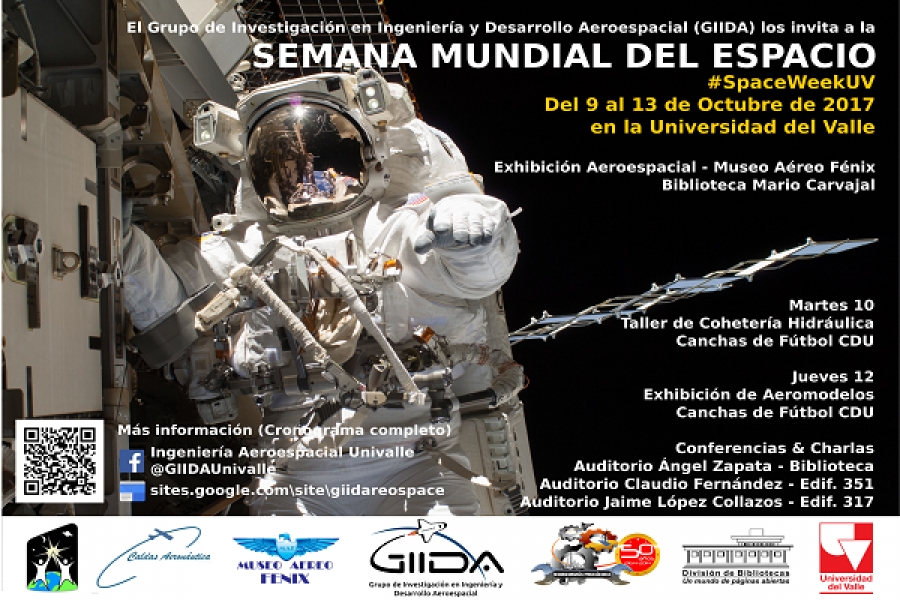 La Escuela de Ingeniería Mecánica de la Universidad del Valle, el grupo de investigación en Ingeniería y Desarrollo Aeroespacial - GIIDA y el Área Cultural de la División de Bibliotecas se suman a la celebración de la ‘Semana Mundial del Espacio’, desde el 9 hasta el 30 de octubre.